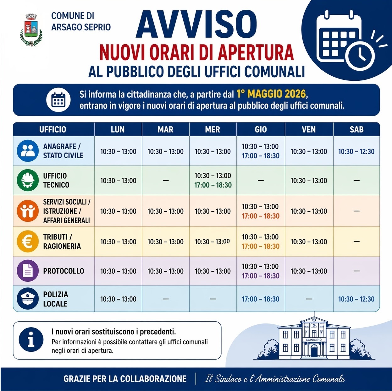 Si comunica che, a partire dal 1° maggio 2026, gli uffici comunali osserveranno i seguenti orari di apertura al pubblico: